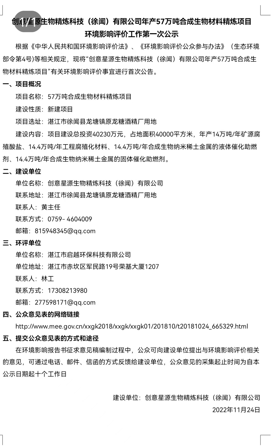 創(chuàng)意星源(徐聞)合成生物材料精煉項(xiàng)目環(huán)評公示